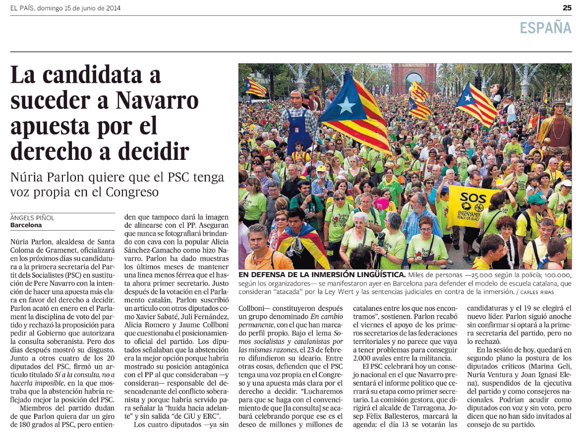Pel matí, en l’edició estatal d’EL PAÍS, eixia aquesta notícia advertint del perill si s’escollia a la batllessa de Santa Coloma de Gramenet, al migdia Núria Parlon deia que no feia el pas i a continuació Miquel Iceta, en el Cosell Nacional del PSC, s’oferia per allò que el partit li demani
