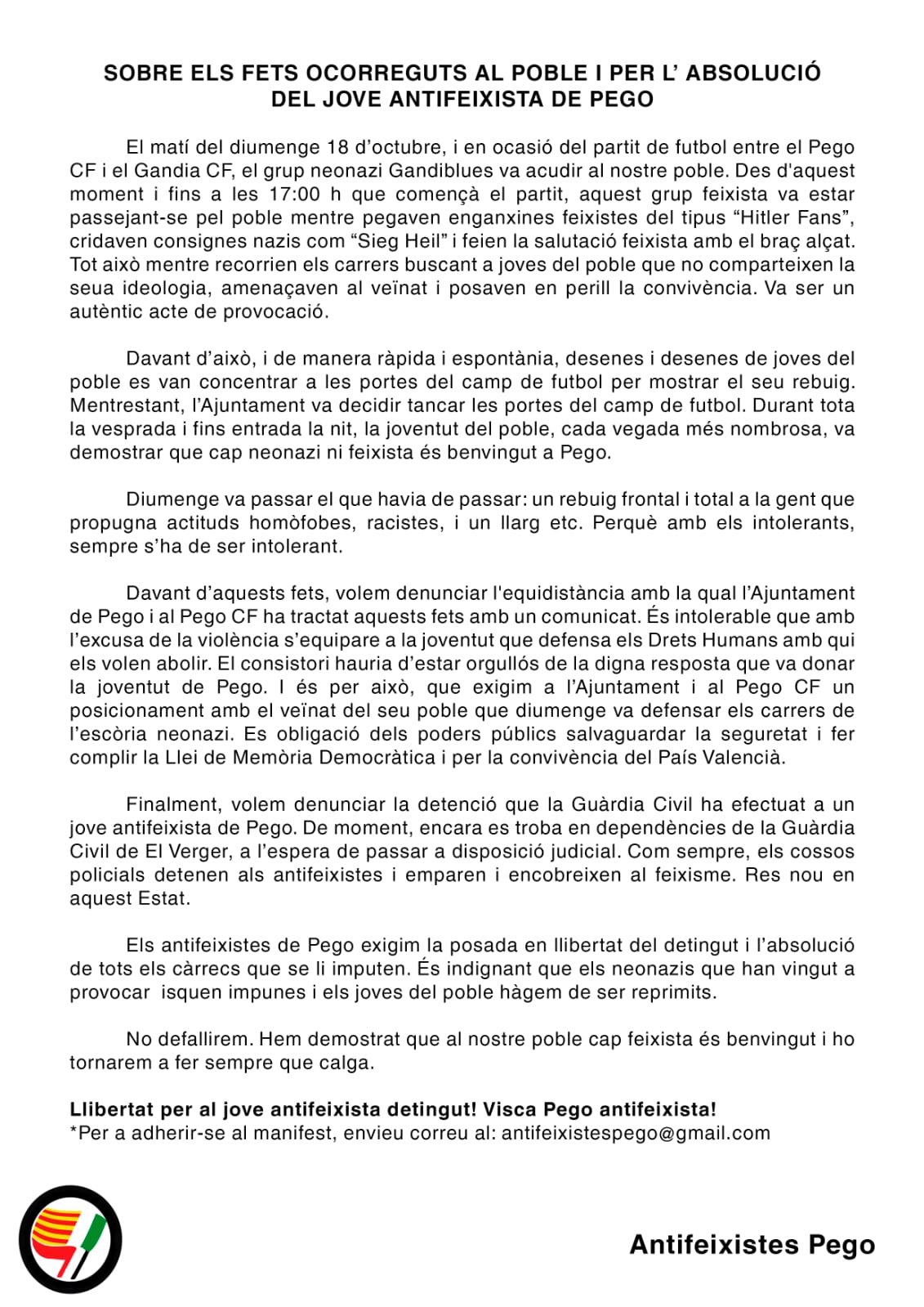2. Denunciem el xantatge i coacció que han rebut els jugadors del València CF per fer-los tornar a jugar. Se’ls ha posat en la tessitura d’haver de triar entre la solidaritat amb el company agredit i l’amenaça de perdre els punts i una possible sanció. Este xantatge ha fet que la responsabilitat de continuar a jugar o no, caiguera sobre la víctima. La víctima al final ha demanat als companys de tornar al terreny de joc. Trobem a faltar una junta directiva del València CF amb valentia, disposada a prendre les responsabilitats pertinents per a defensar els seus jugadors fins a les últimes conseqüències.