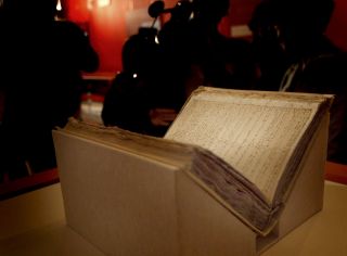 Un volum del llibre del Repartiment durant l’exposició que es va realitzar a Sant Miquel dels Reis en 2008 arran del 800 aniversari del Naixement de Jaume I |