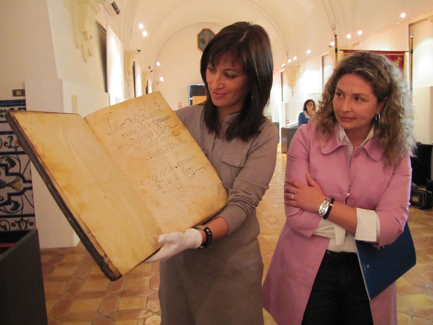 Un volum del llibre del Repartiment durant l’exposició que es va realitzar a Sant Miquel dels Reis en 2008 arran del 800 aniversari del Naixement de Jaume I |
